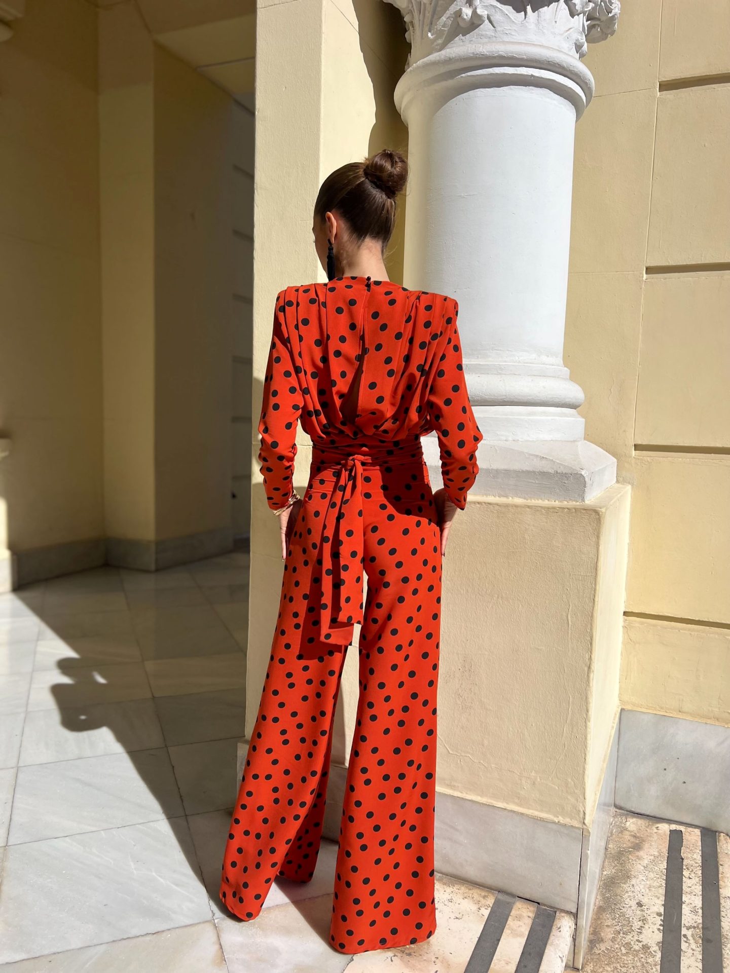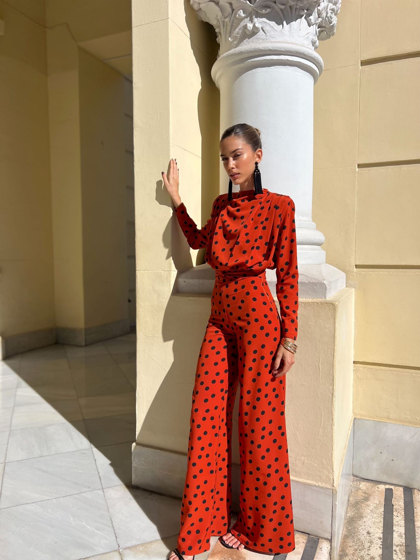 Top plisado con hombreras, manga recta y lazada trasera. Pantalón palazo de cintura alta